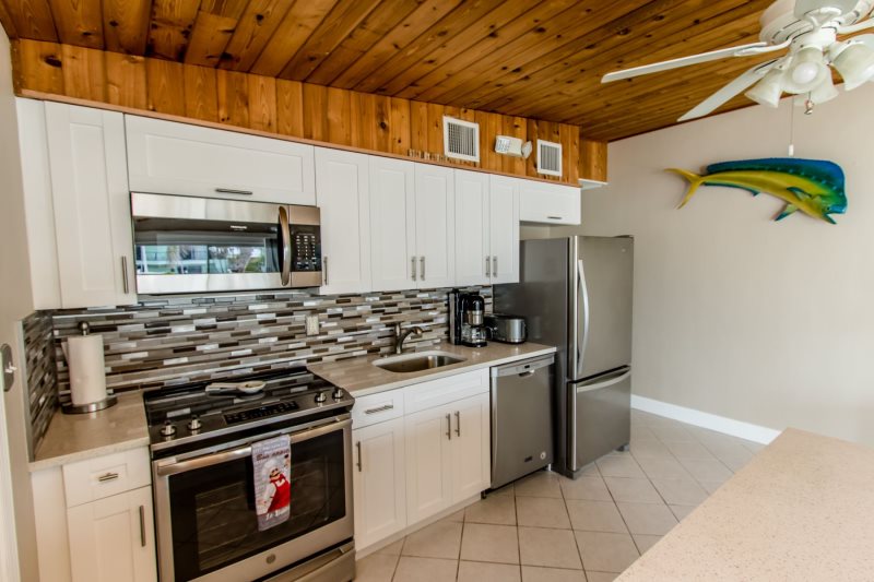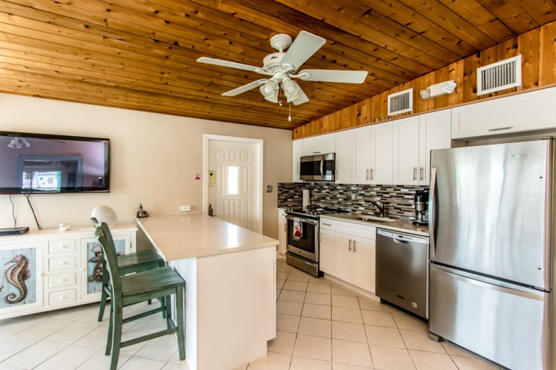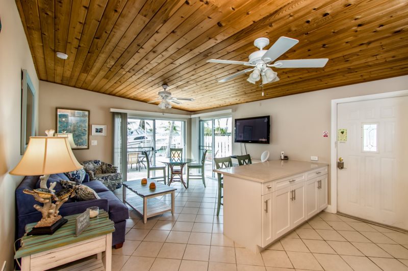 Kitchen and Living room is designed with an open floor plan giving you a relaxed feeling and outdoor views. Sliding Glass Doors on the North and West side of the living room provide open and spacious views, with light breezes and sounds of island laughter and music from various watercraft returning from a day on the ocean.