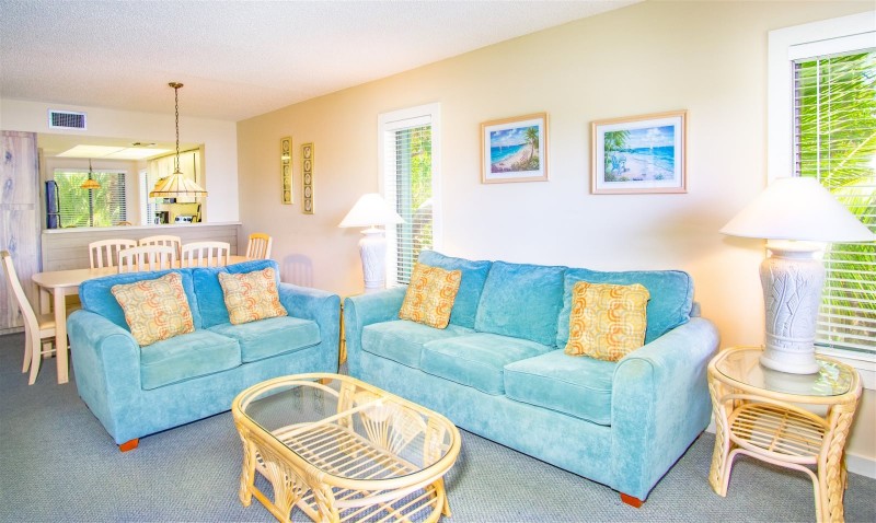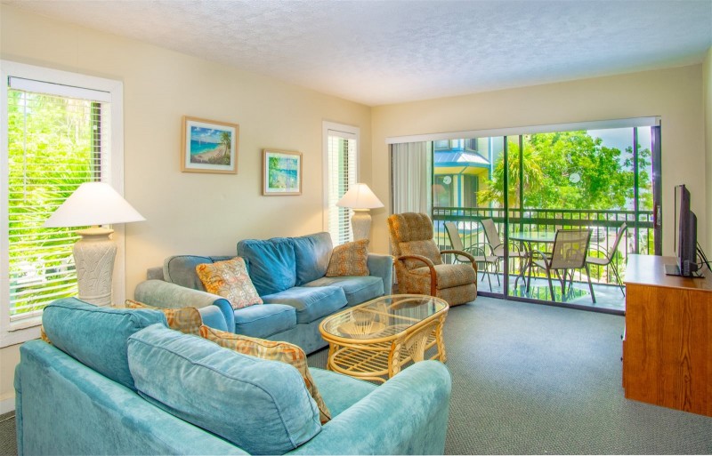 Marathon Key Beach Club units are 2 bedroom 2 bathroom rentals. The master bedroom has a king size bed, and a full bathroom with large tile shower. The second bedroom has two twin beds. Bed and bath linens are provided. There are two televisions in the unit, one is in the master bedroom, the other is in the living room with digital cable and free wireless internet. The units have central air conditioning.