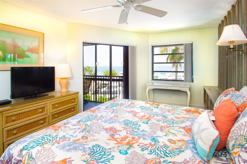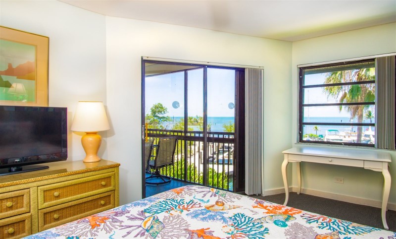 Marathon Key Beach Club units are 2 bedroom 2 bathroom rentals. The master bedroom has a king size bed, and a full bathroom with large tile shower. The second bedroom has two twin beds. Bed and bath linens are provided. There are two televisions in the unit, one is in the master bedroom, the other is in the living room with digital cable and free wireless internet. The units have central air conditioning.