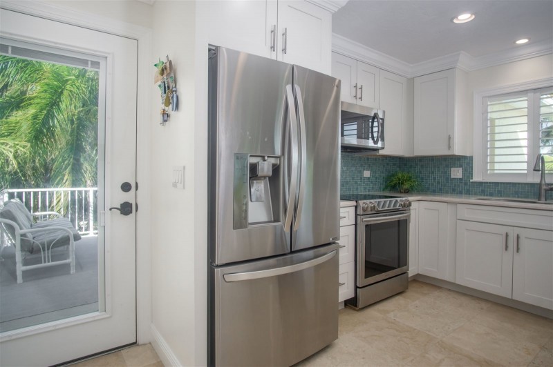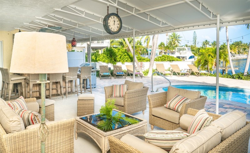 The upstairs has a deck that opens up to view the pool, dock and Ocean.