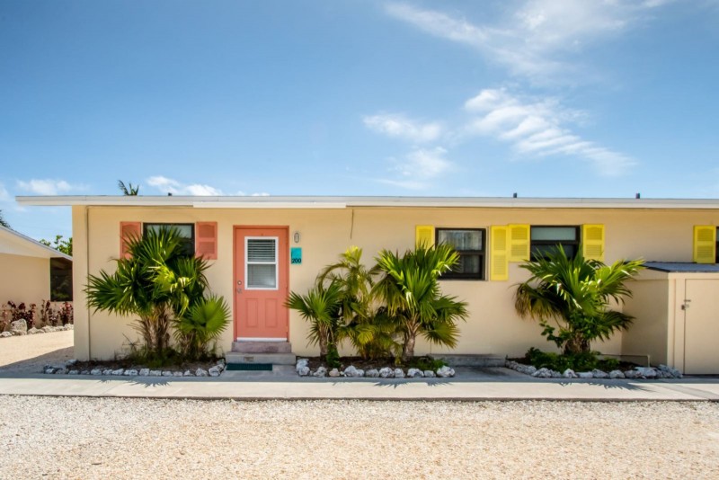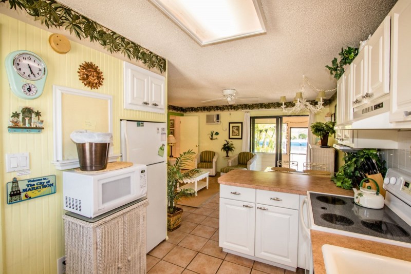 This condominium at The Reef in Marathon, Middle Keys is a true resort setting with a “home away from home” feel. This unit is fresh, and comfortable. It features 2 bedrooms and 3 bathrooms. The one bedroom side has an open kitchen & living room floor plan. The bedroom consists of a king bed and on suite bath. There is a second bath off the kitchen when you first come in. Plus a sleeper sofa. The efficiency side features a small kitchenette and even a small dining table. This side features a king bed. The onsite pool is surrounded by comfortable chairs to lounge in and all guests are welcome to complimentary use of onsite bikes, kayaks, canoes and paddle boats for exploring. Plus there are tennis courts, laundry facility, shuffleboard, ping pong, and BBQ grills onsite to grill some freshly caught fish.