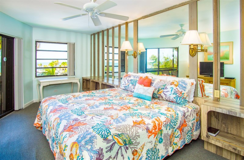 Marathon Key Beach Club units are 2 bedroom 2 bathroom rentals. The master bedroom has a king size bed, and a full bathroom with large tile shower. The second bedroom has two twin beds. Bed and bath linens are provided. There are two televisions in the unit, one is in the master bedroom, the other is in the living room with digital cable and free wireless internet. The units have central air conditioning.