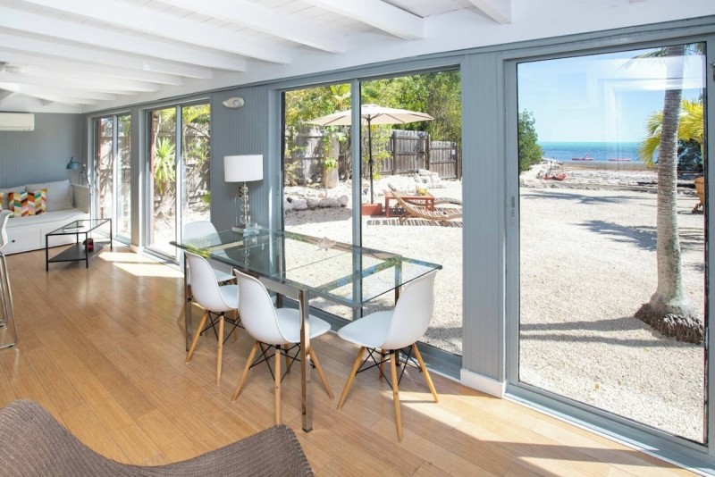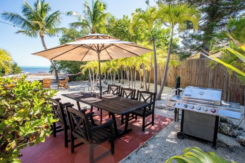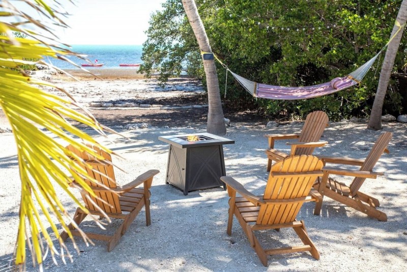 Our lucky seafront location enables our guests to go for a swim and discover the magnificently preserved underwater life, as well ...as use the two kayaks included in the rental. You will be able to enjoy the beautiful scenery from the private garden in the hammock, from one of the lounge-chairs close to the propane fire pit table with lid, at the dinner table, around our modern barbecue or from the inside of our house through the large Florida Bay.