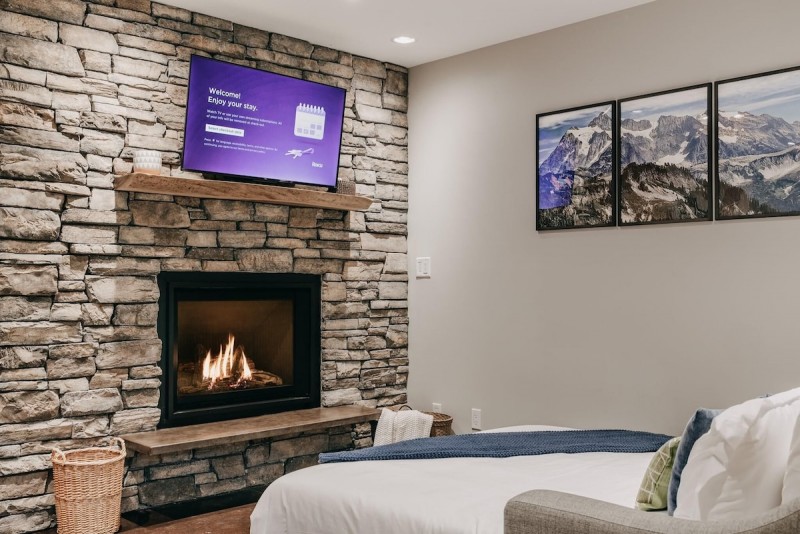This newly remodeled, ground-floor ensuite is a perfect getaway for two. Entering through the double doors, you'll find an American Leather sleeper sofa with a day bed, a flat-screen TV with Starlink, and a beautiful built-in gas fireplace. Walking into the kitchen, you'll find a cute dining table and all modern appliances, including a dishwasher, a stovetop and oven, an apartment-sized refrigerator, a microwave, a toaster, and a coffee maker. There is one full bath and a stackable washer/dryer. Outside is a gas BBQ and chairs for you to sit and drink your favorite beverage. Also, a parking spot is just for you! This vacation property will comfortably sleep up to 2-persons (ENFORCED Maximum Occupancy!).