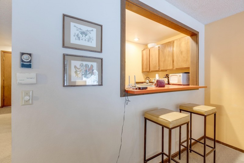 Snowater Condo #33 - A Little Slice of Heaven! Your family will enjoy the mountain experience in this 1-bedroom, 1-bath ground-floor condo. Accessed by descending four steps, you’ll discover one bedroom with 1-queen sized bed augmented by plenty of closet space, one full bath, a galley style kitchen complete with a dishwasher, and an open concept living and dining area with a hide-a-bed, a small flat screen monitor, a great gas fireplace, a dining table with seating for 4-persons, plus a walk-out balcony with great territorial views. This Wi-Fi-equipped and monitored family vacation property will sleep 2 to 4 people (ENFORCED Maximum Occupancy!).