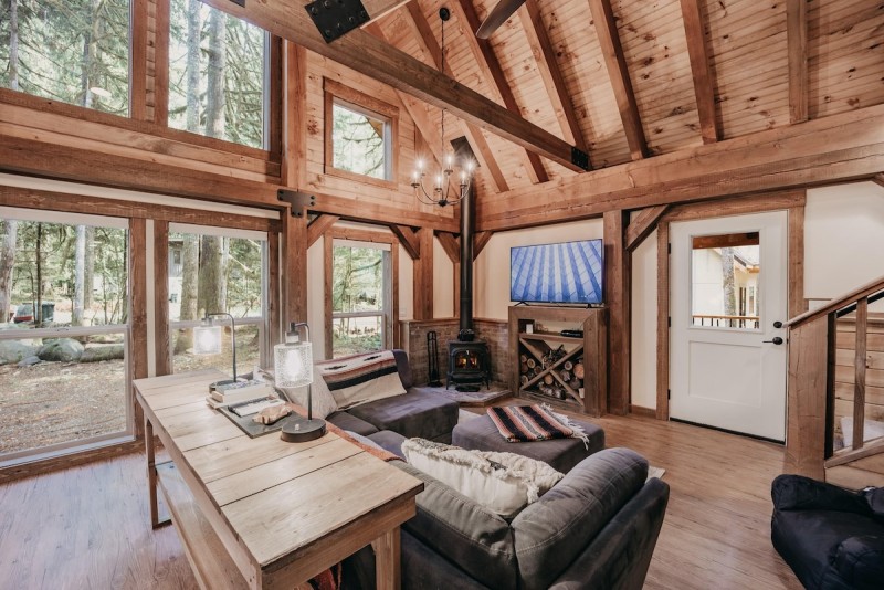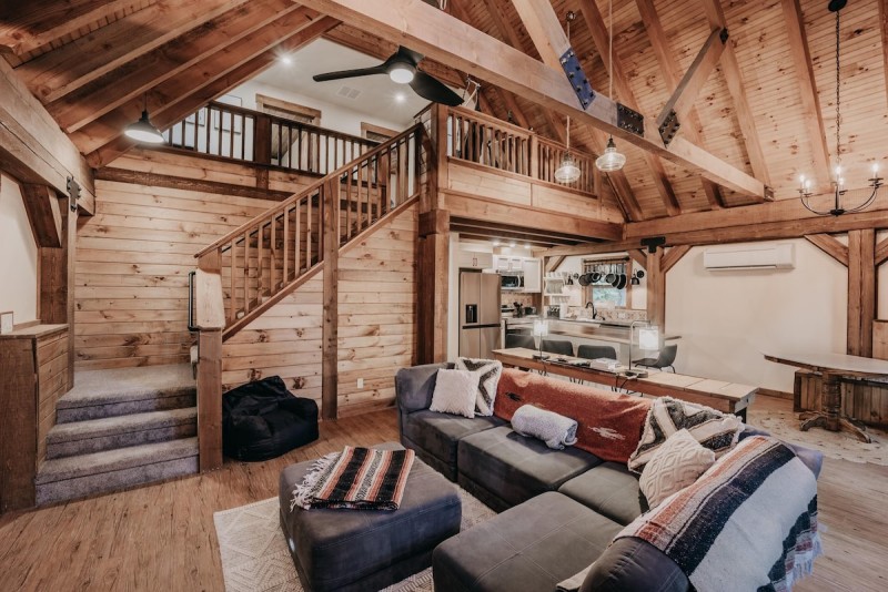 Your family will have a wonderful time making lasting memories while staying in this brand new rustic/chic 2-story, 3-bedroom, 2-bath home. Lovingly hand-crafted from timber sourced on the premises, this brand-new and beautiful home personifies a modern-day rendition of a “cabin-in-the-woods.” Upon entering the open living, dining, and kitchen area with vaulted ceilings and floor-to-ceiling windows offering great territorial views, you’ll be thrilled with all of the incredible attention to detail, including a custom kitchen island workstation/breakfast bar with seating for four, plus a separate table/seating area for two, a higher-end LG stainless appliance package including a dishwasher, a farmhouse sink, a comfy corner group sofa facing a freestanding wood fireplace, (firewood provided) and a large flat screen monitor.