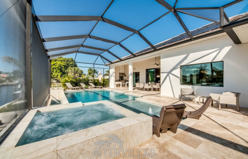 Welcome to this 2017 built luxury Villa, which fulfils all your wishes. Located in the south of Cape Coral the villa faces south and is only a a stones’s throw away from the Yacht Club and shopping facilities. The Gulf of Mexico can be reached within 5 minutes by boat.