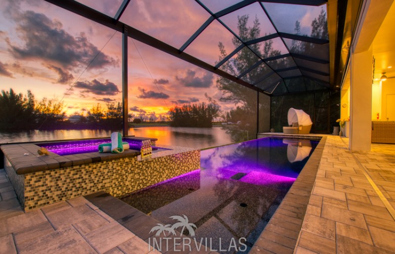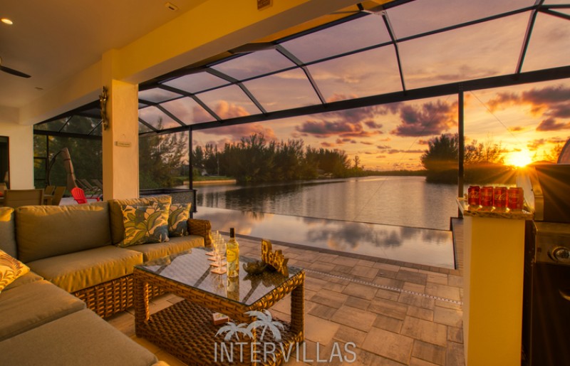 Spacious, west facing pool area for best views over the Cape Coral Sunset. A special highlight in the pool: If you let the bar stools, which are custom made, into the water, you can watch the next Superbowl directly from the pool with a bottle of beer. Flatscreen-TV on the Lanai!