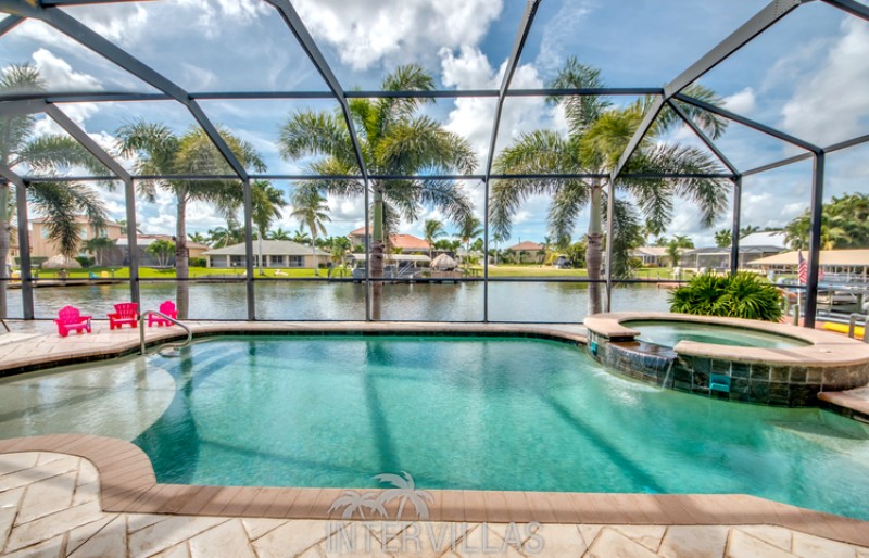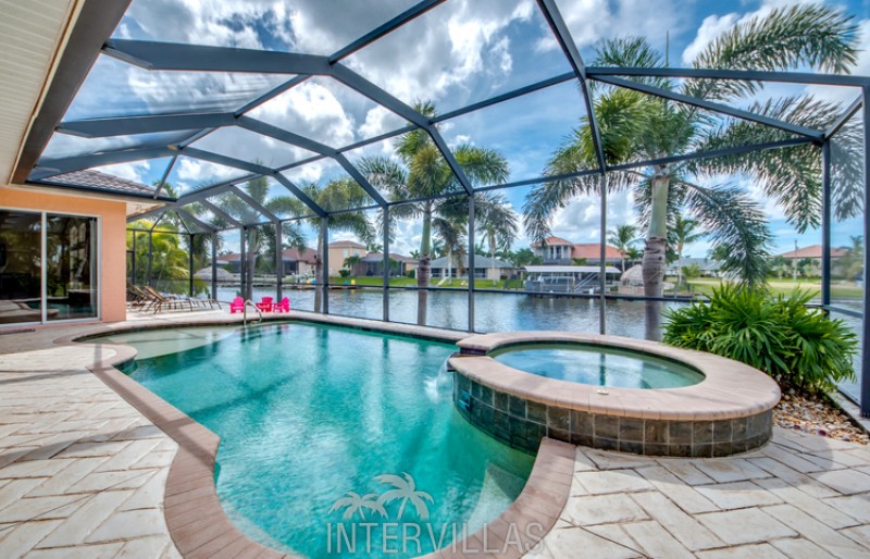 Spacious lanai which is south facing and overviews the wide canal. The pool offers a separate whirlpool and is covered completely by a mosquito screen. The low water zone is especially popular with the small guests of Villa Blue Sky, but also sun lovers love to put a sunlounger in it and work on their complexion while having the feet in the chilling water. Enjoy the view while your perfect, juicy US-steak is sizzling on the BBQ. Comfortable sunloungers, kids sun chairs and a great sun deck with a breathtaking view over the open water.
